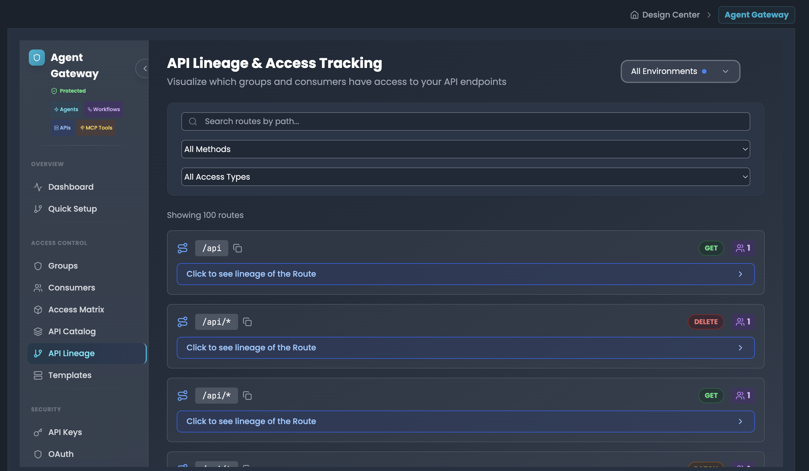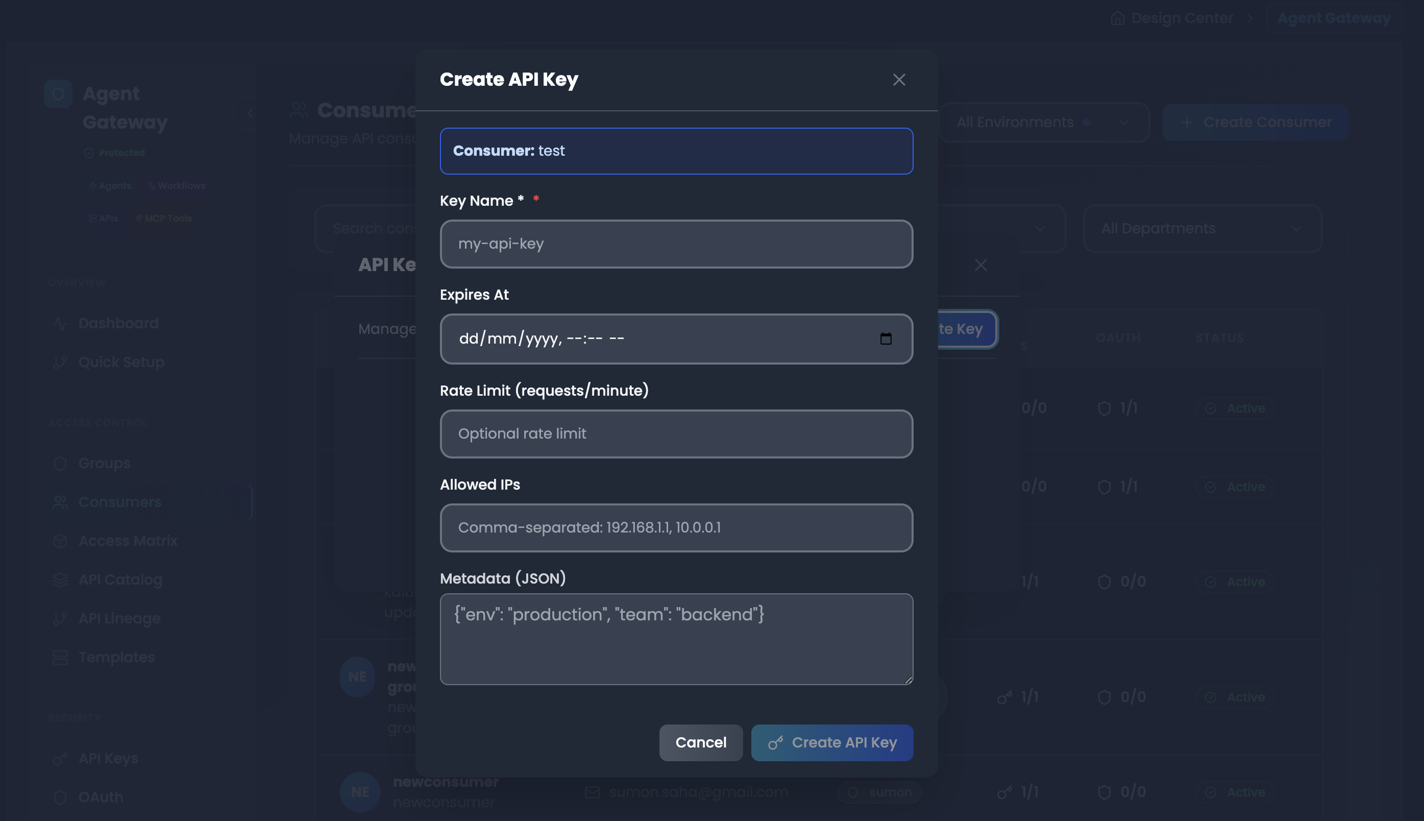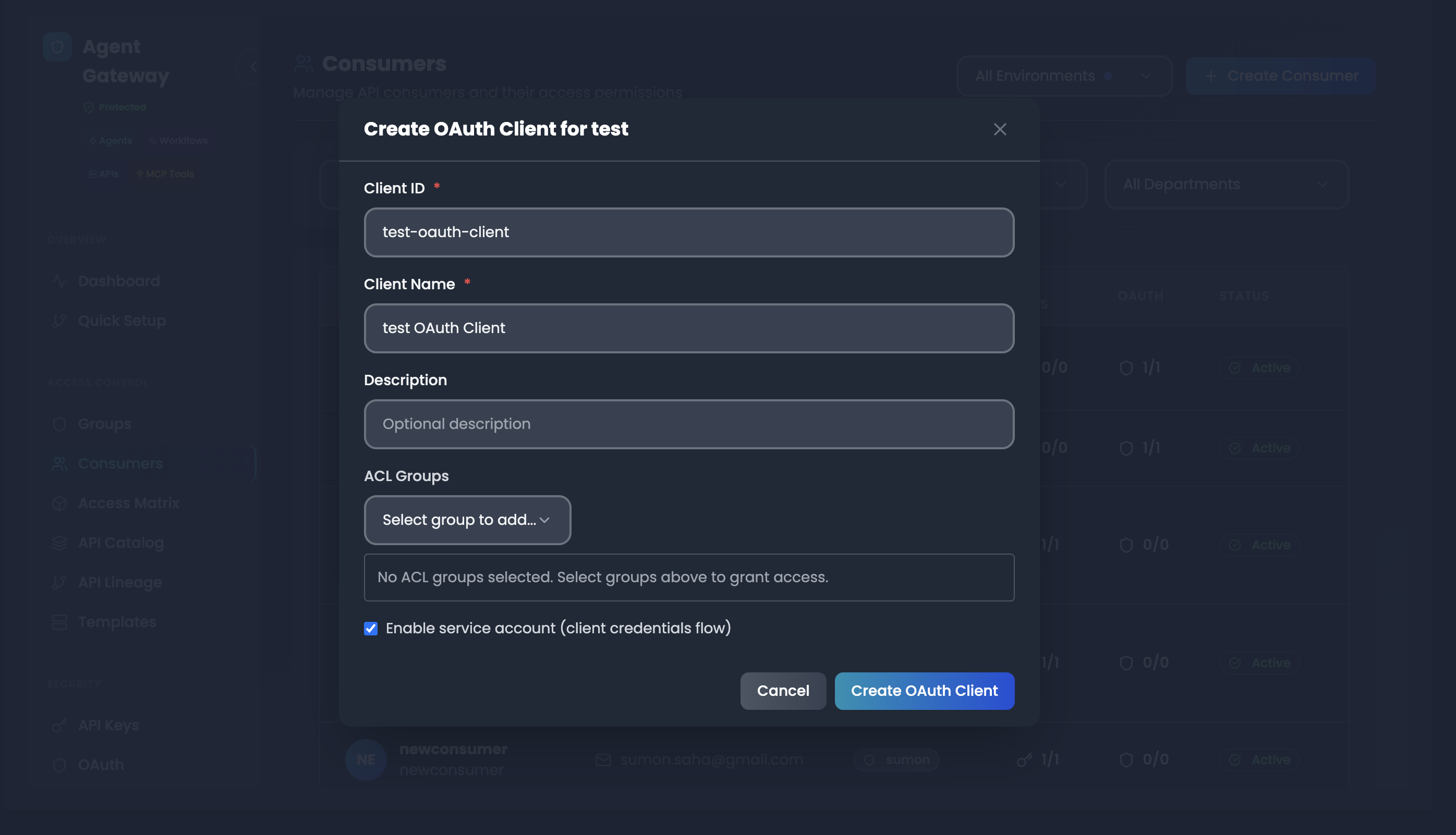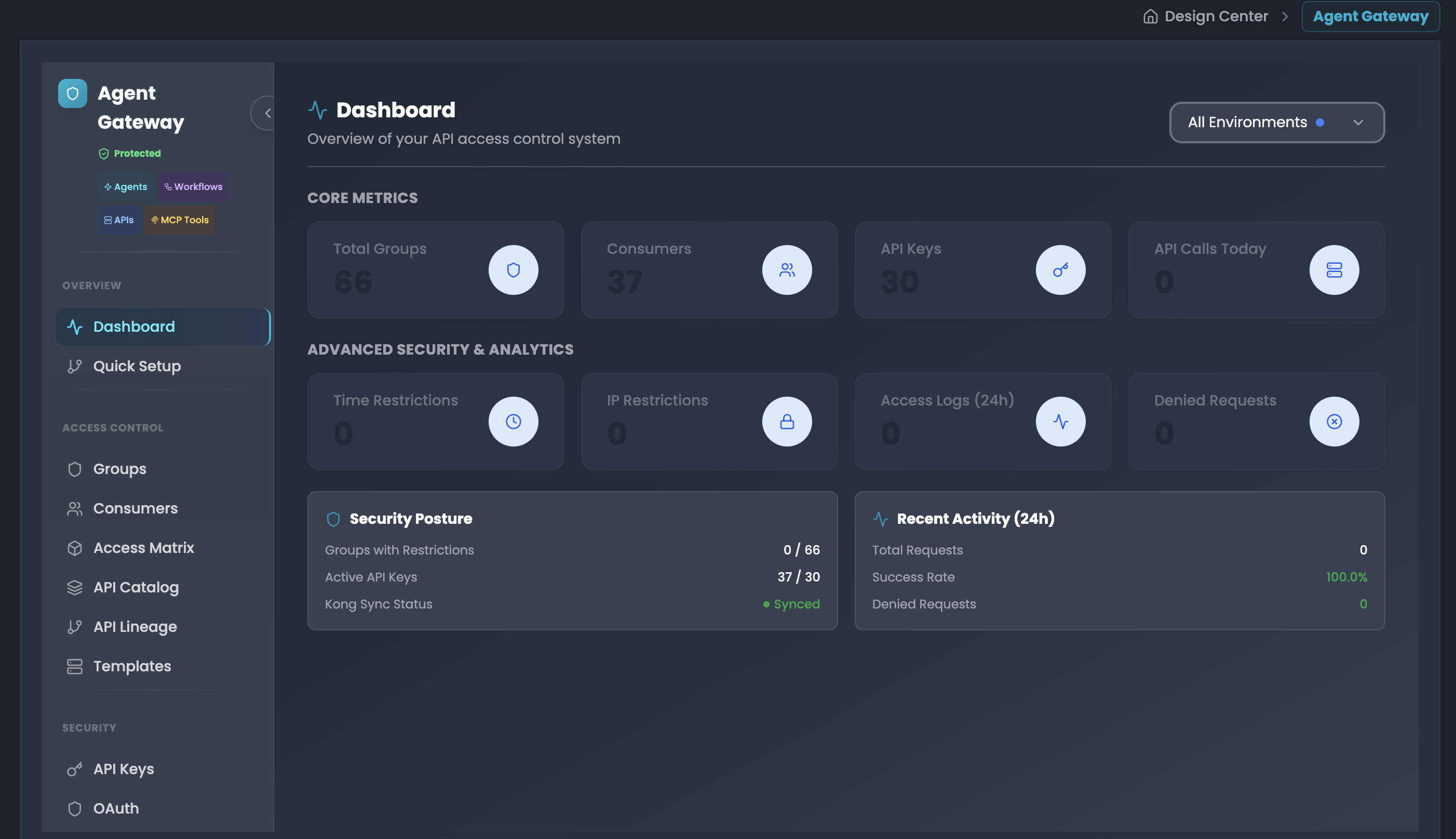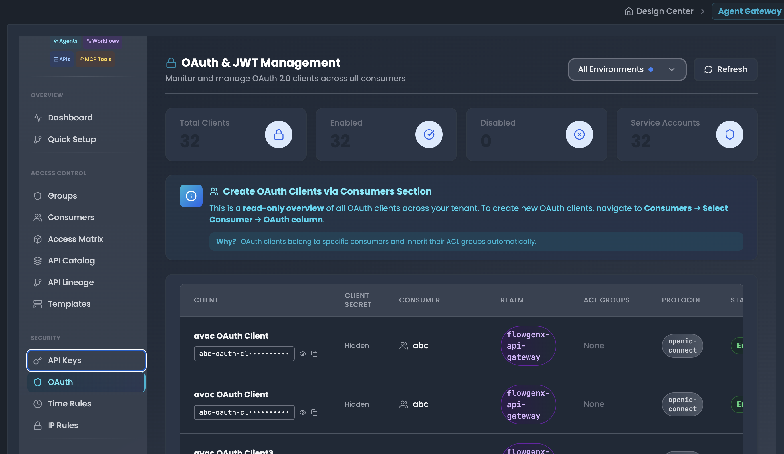 The FlowGenX Agent Gateway provides comprehensive access control management for your APIs. This guide will help you set up groups, manage consumers, and control who can access your services through a powerful permission-based system.