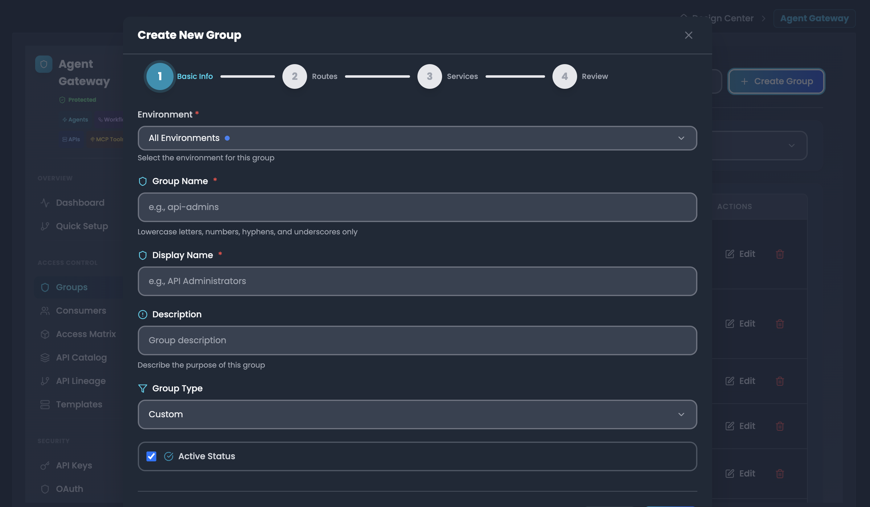 - Allowed Routes: Specific API endpoints that group members can access (whitelist)