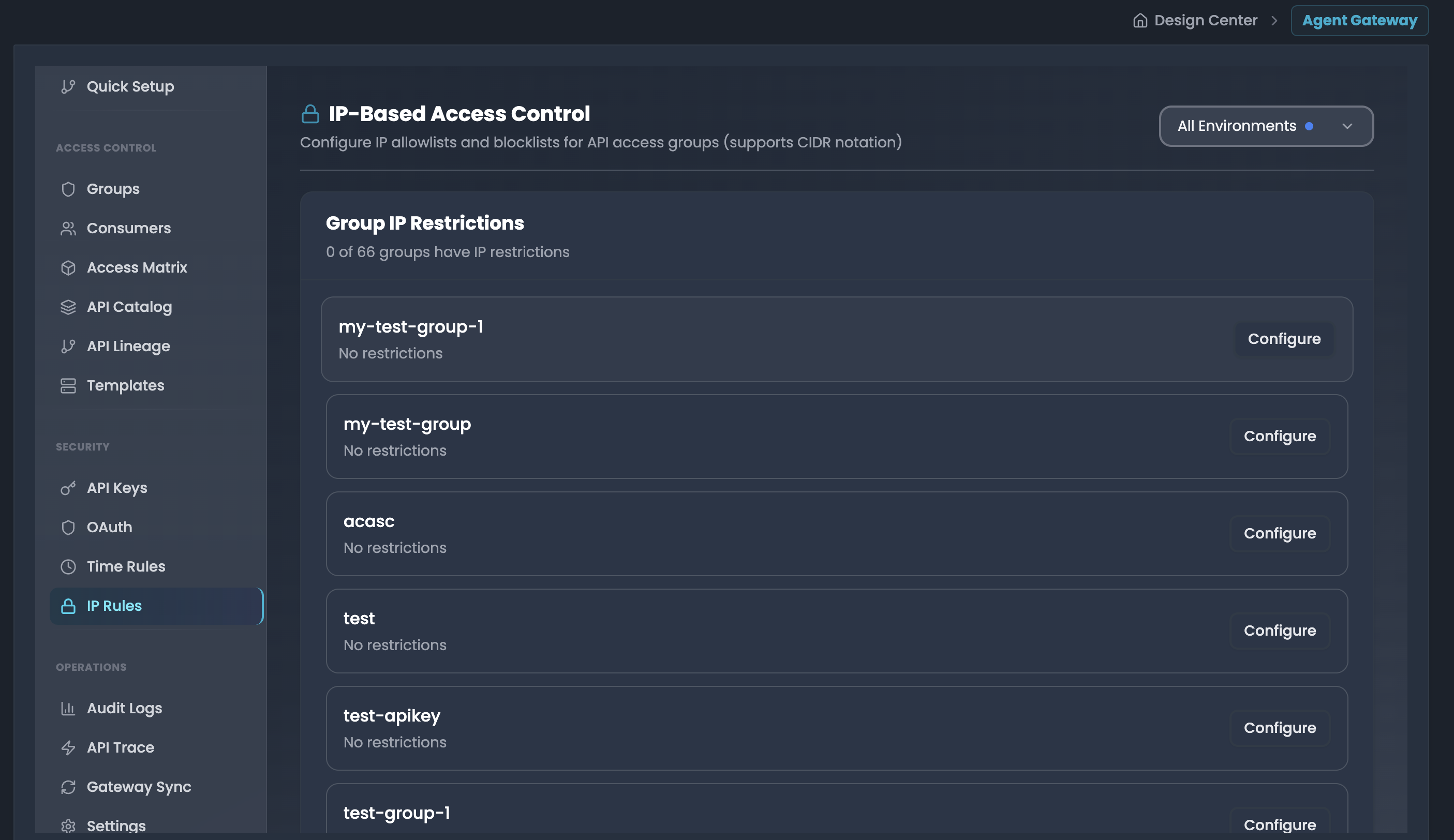 Configure IP allowlists and blocklists for API access groups (supports CIDR notation).