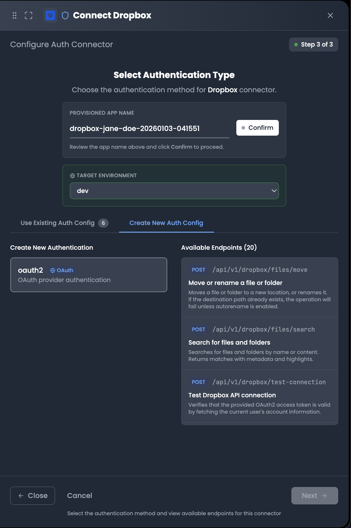 | Auth Config | Use an existing auth configuration or create a new one |