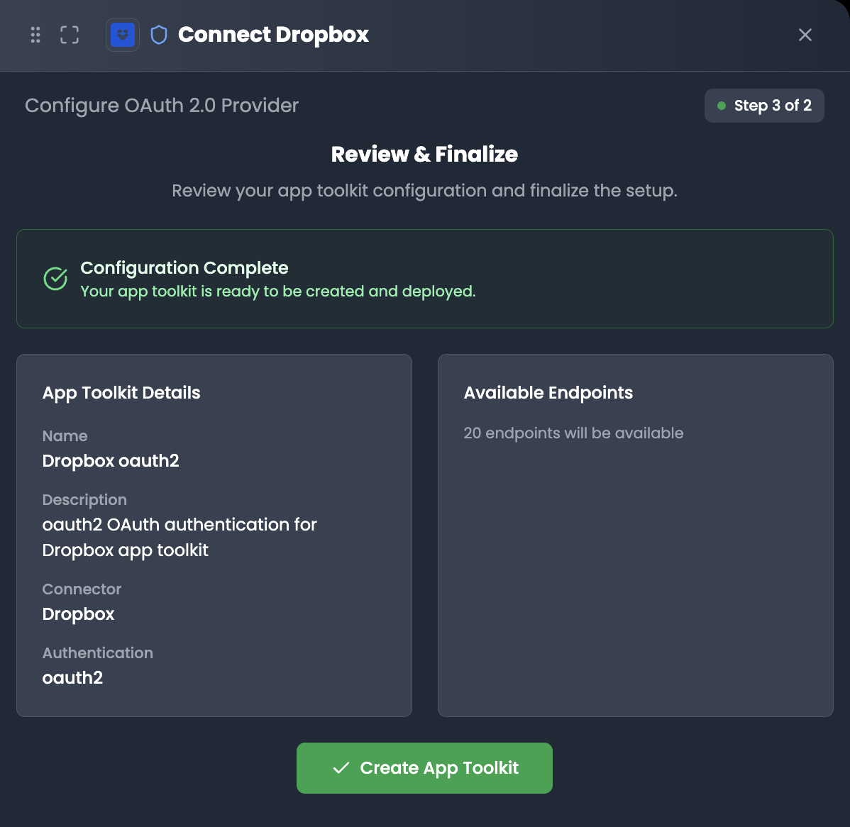 - Create App Toolkit: Click Create App Toolkit to finalize the connection