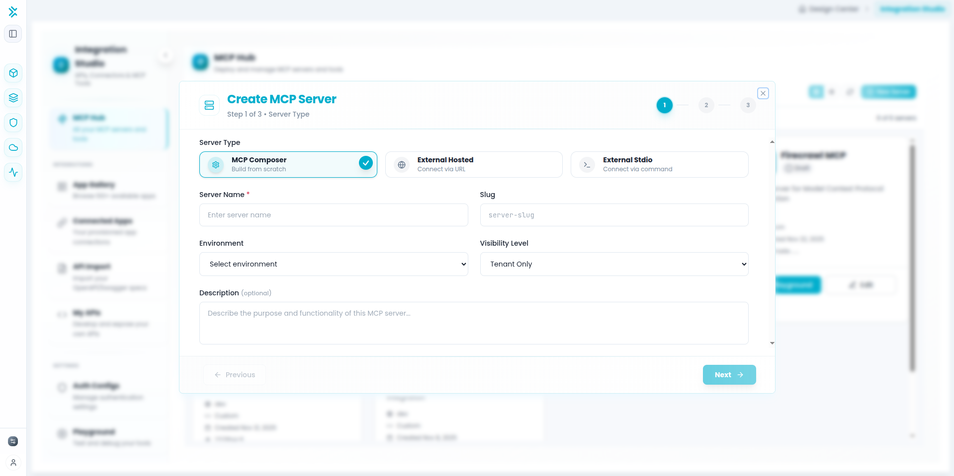 Navigate to Integration Studio → MCP Servers and click Create MCP Server. Select "MCP Composer" as the server type to build from scratch.