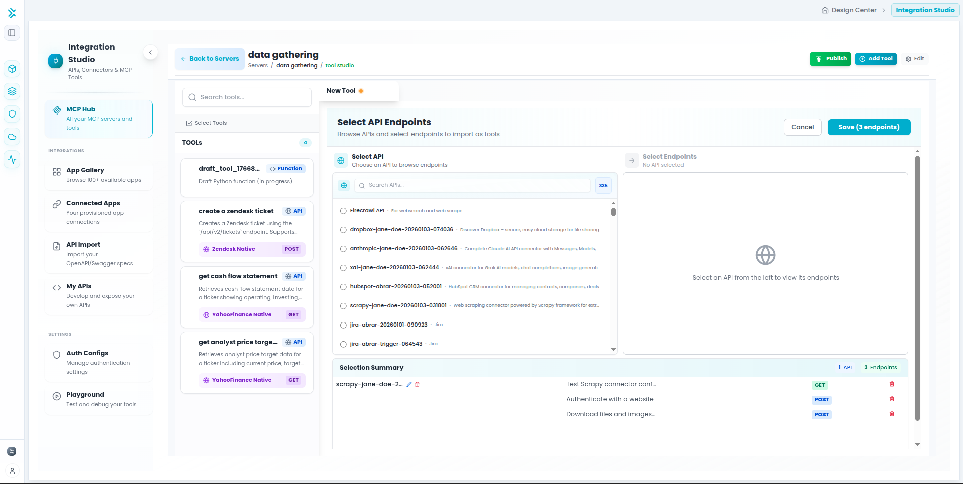 Key Feature: You can combine endpoints from different API sources—select tools from your CRM API, payment gateway, analytics platform, and more, all in one MCP server.
