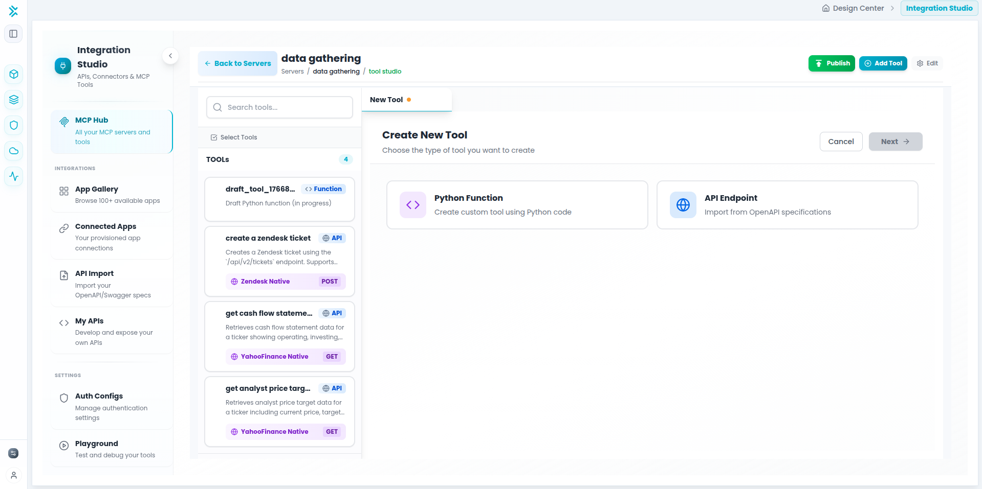 Mix API endpoints and Python functions freely—create exactly the tool set your agents need.
