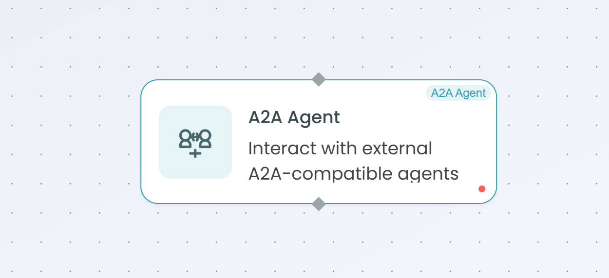 The A2A (Agent-to-Agent) Agent node enables communication and orchestration between different agents across workflows. This powerful node allows workflows to discover, execute, monitor, and control other agents in the FlowGenX ecosystem, enabling complex multi-agent architectures and distributed task execution.