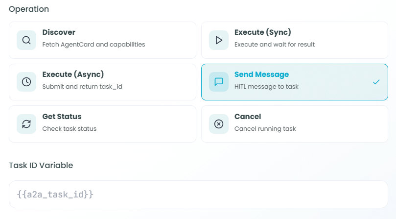 Send Message allows you to send human-in-the-loop (HITL) messages to a running agent task, typically to provide input or respond to agent requests.