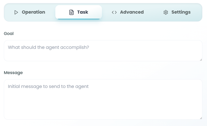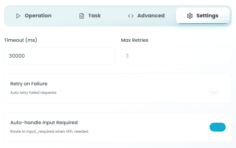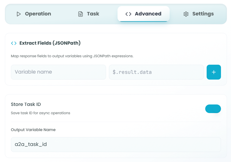 Setting up the A2A Agent involves 4 main configuration areas: Operation, Task, Advanced, and Settings. The available configuration options vary based on the selected operation type.