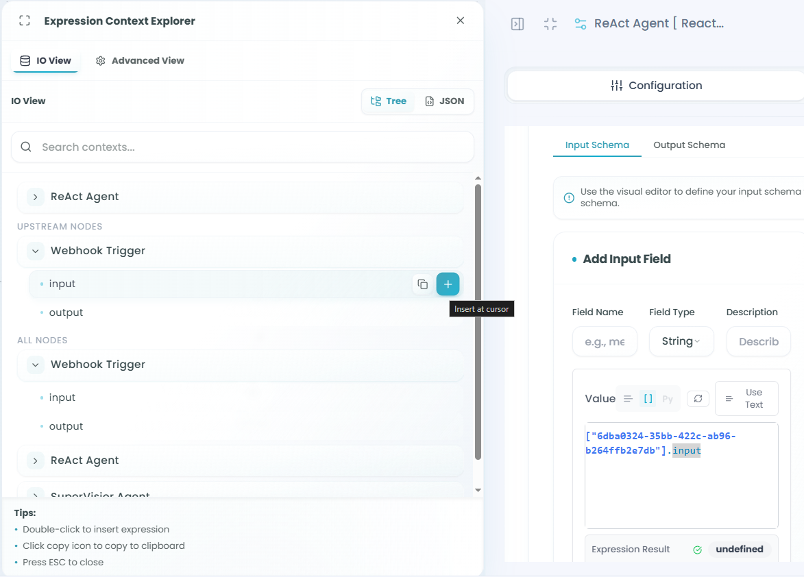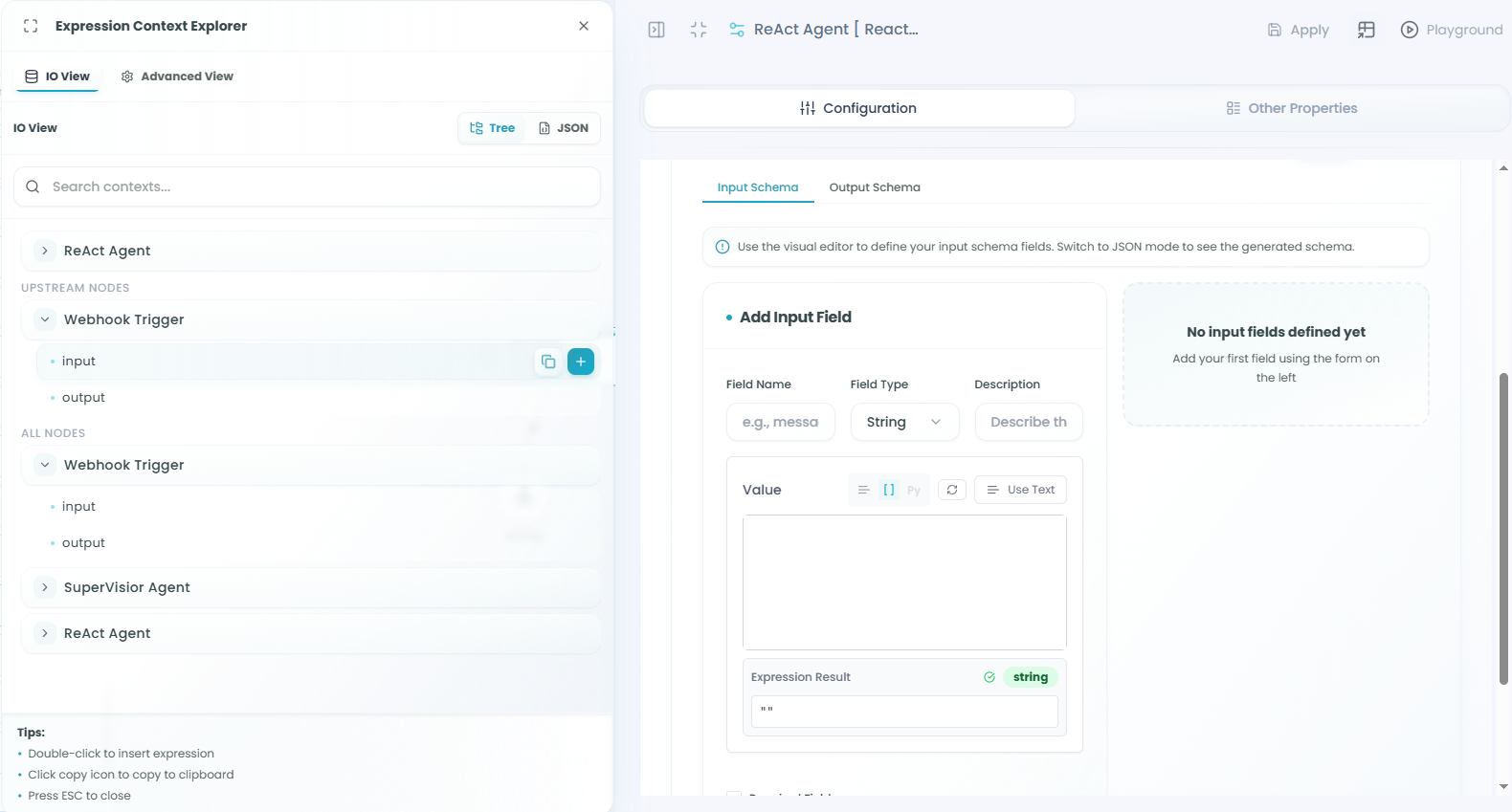 The React Agent node provides intelligent, autonomous workflow execution capabilities powered by large language models (LLMs). This agent uses advanced reasoning to understand tasks, plan actions, and execute complex multi-step operations within your workflows. The React Agent can make decisions, process data, and interact with other workflow components using natural language instructions.