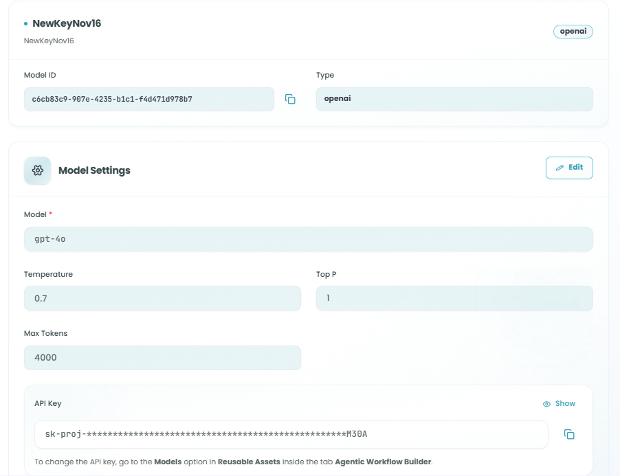 - Note: To change the API key, go to the Models option in Reusable Assets inside the Agentic Workflow Builder