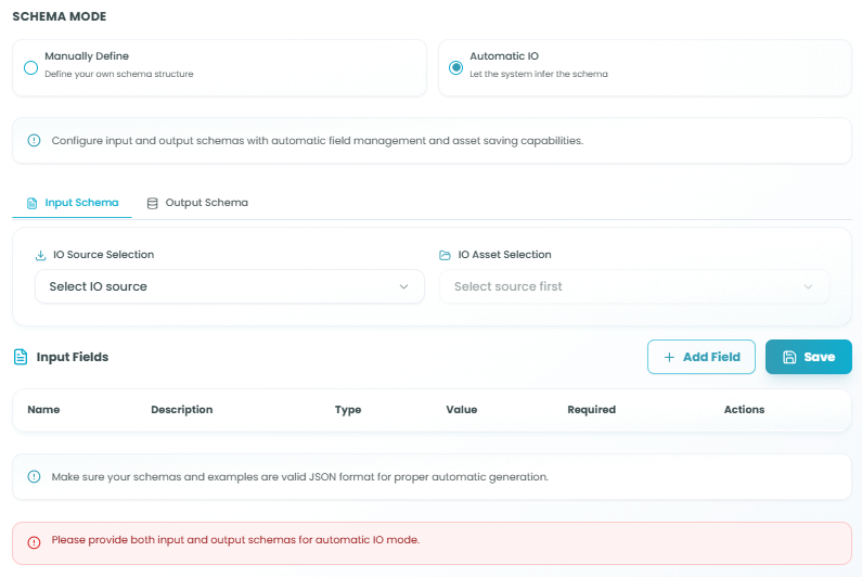 "Analyze the following text: {{input_text}}" - Variables must be defined in the Schema tab (Input Fields)