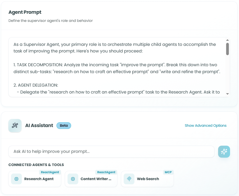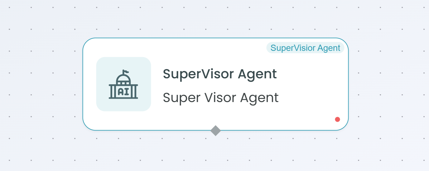 The Supervisor Agent node enables coordination and management of multiple React Agents and tools within your workflows. Acting as an intelligent orchestrator, the Supervisor Agent delegates tasks to specialized child agents and tools, manages their execution, and synthesizes their outputs into cohesive results. This agent is powered by large language models (LLMs) to make intelligent decisions about task routing and delegation.
