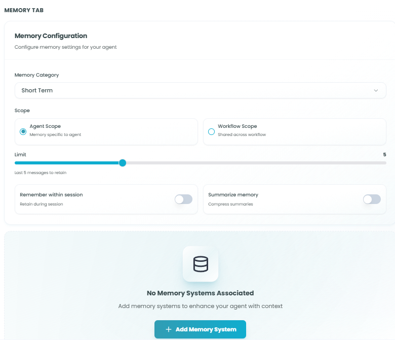 The Memory tab for the Supervisor Agent works identically to the React Agent, controlling how the supervisor remembers context across executions.