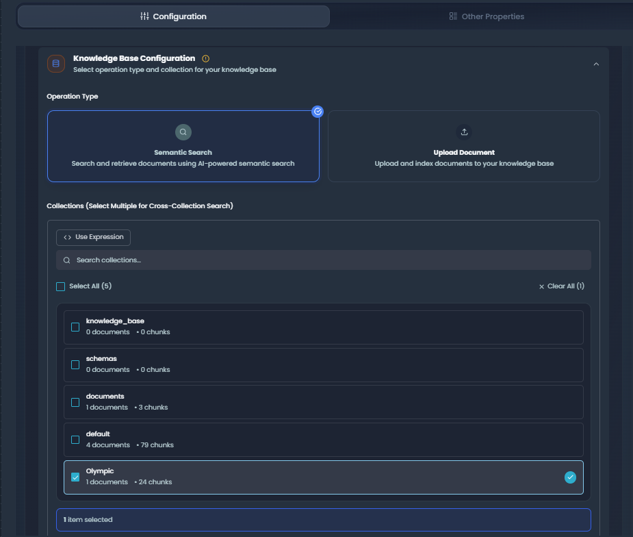 Choose one or more collections to search across. The node supports multi-collection search, allowing you to query multiple knowledge bases simultaneously for comprehensive results.