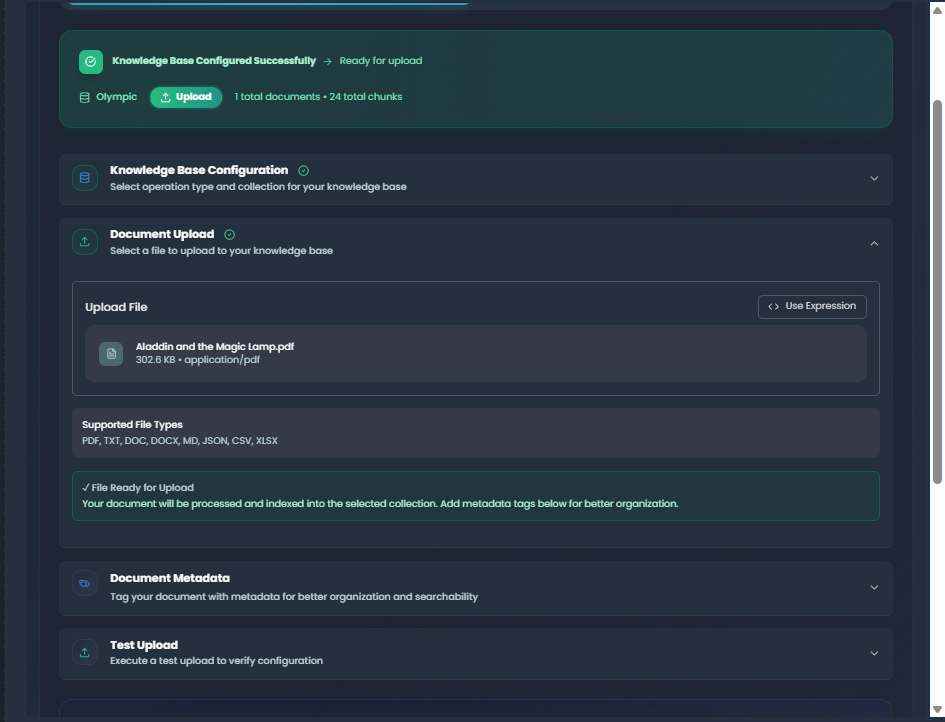 The Upload Document operation enables file upload with automatic chunking, embedding generation, and metadata tagging for enhanced organization.