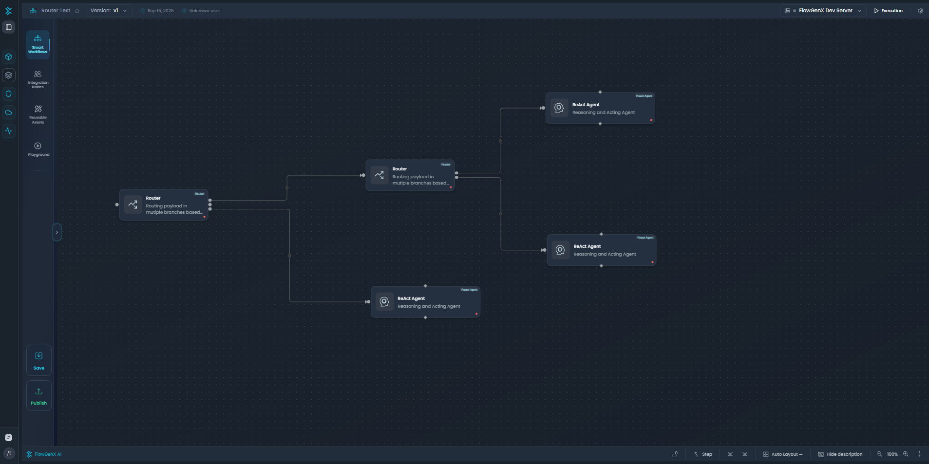 In this example, Router nodes evaluate conditions and route payloads to different branches, enabling complex decision-making in workflows. Each Router node can have multiple output paths, allowing for sophisticated data routing patterns.