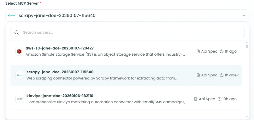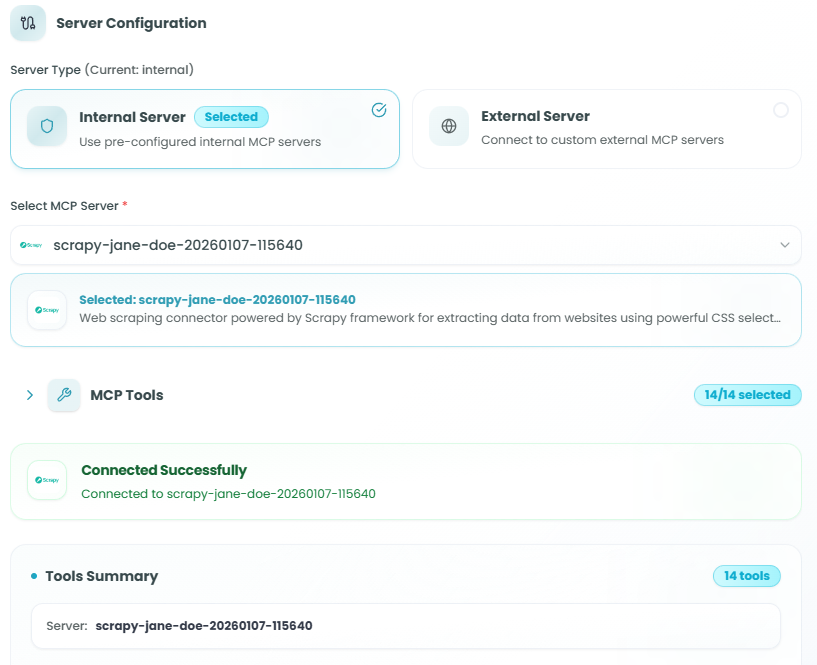 First, choose where your MCP server is hosted - either internal pre-configured servers or external custom servers.