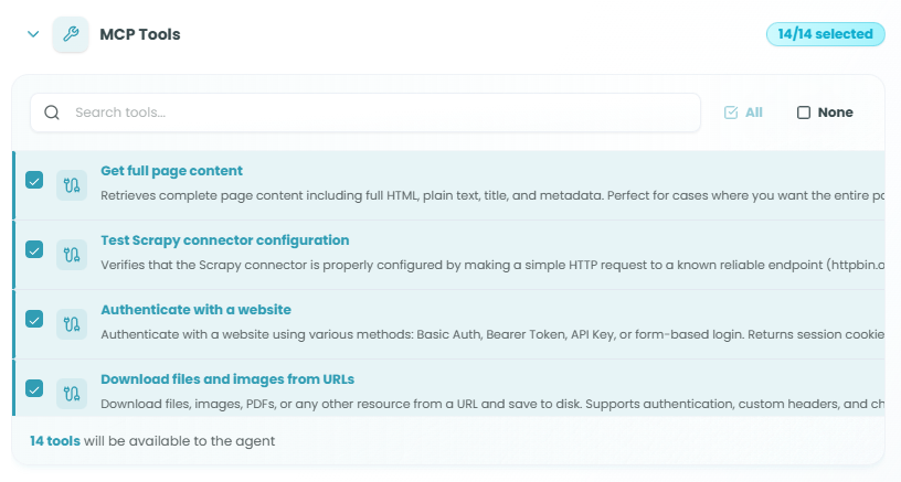 - Access multiple tools efficiently - Select multiple or all tools from a server in a single configuration