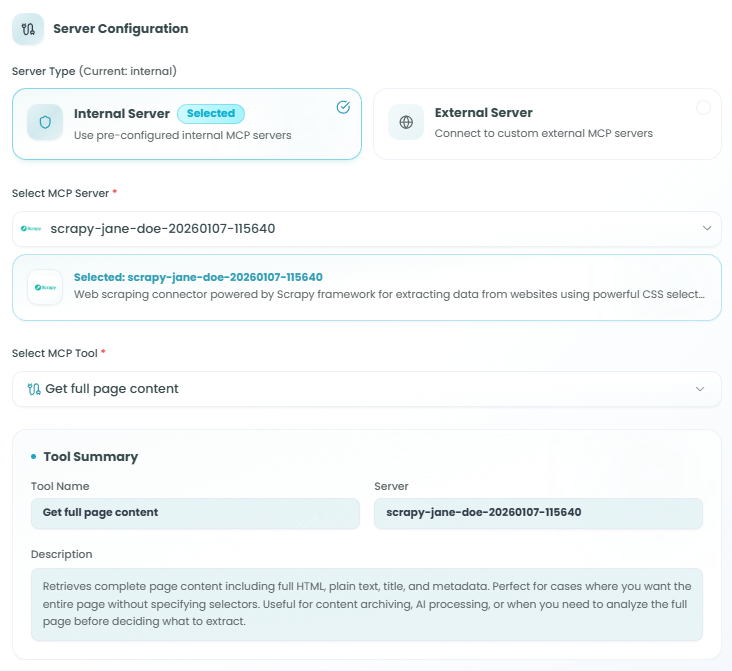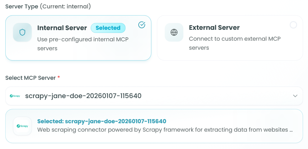 First, choose where your MCP tool will come from - either internal pre-configured servers or external custom servers.