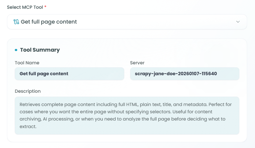 - Example: "Retrieves complete page content including full HTML, plain text, title, and metadata. Perfect for cases where you want the whole page without specifying selectors. Useful for content archiving, AI processing, or when you need to analyze the full page before deciding what to extract."