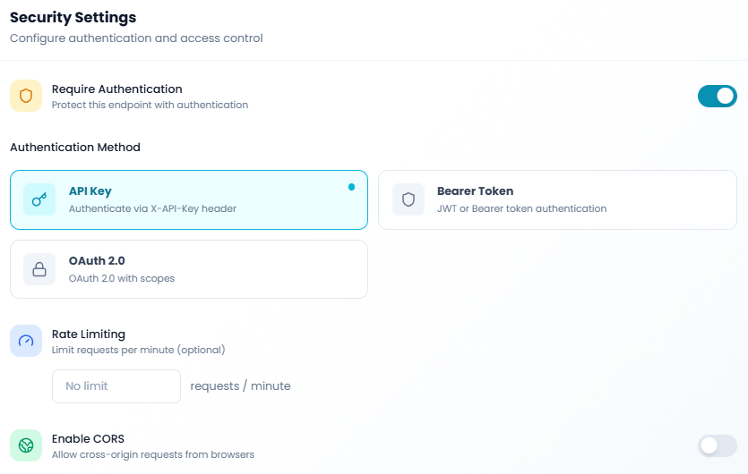 - Control authentication - Secure your endpoints with API keys, Bearer tokens, or OAuth 2.0