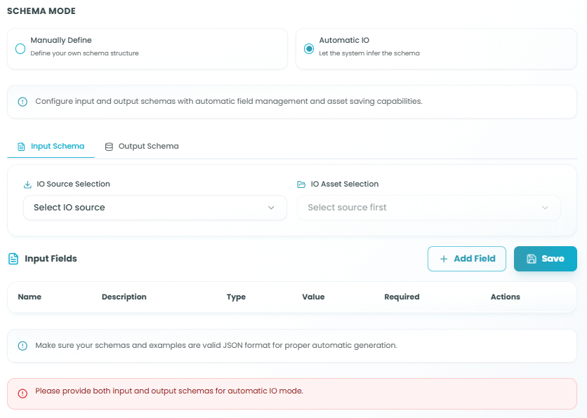 Note: Configure input and output schemas with automatic field management and asset saving capabilities. Make sure your schemas and examples are valid JSON format for proper automatic generation.